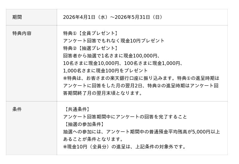 楽天銀行株式会社(本社:東京都港区、代表取締役社長:東林 知隆、以下「楽天銀行」)は、本年7月23日に創業25周年を迎えるにあたり、本日4月1日(水)より創業25周年記念ページを公開しました。あわせて、創業25周年記念キャンペーンの第一弾として、アンケートにご回答いただいたお客さまに現金最大10万円をプレゼントする特別企画を実施します。