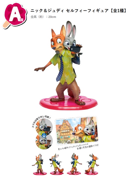 ◆A賞にはニック&ジュディのセルフィーフィギュアが登場!他にもアロハシャツやシリコンアイストレーなどズートピアの世界観が楽しめるアイテムがラインナップ。Last賞はニック&ジュディの特大ぬいぐるみセット!