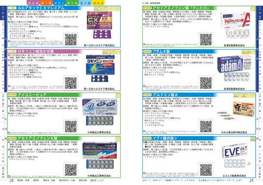 1000の市販薬製品の情報を1冊にまとめました。1頁に4製品、見開きで8製品を同時に見ることができます。