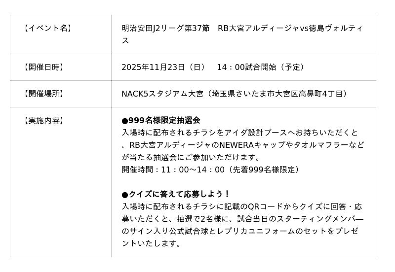 この度、株式会社アイダ設計(本社:埼玉県上尾市、代表取締役社長:會田 貞光)は、2025年11月23日(日)に開催されるRB大宮アルディージャvs徳島ヴォルティスにおいて、プレゼンツマッチパートナーとして協賛いたします。