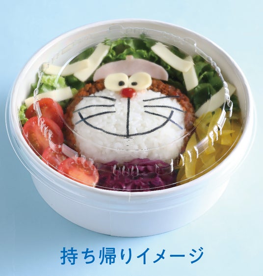 「カラフルタコライス」『映画ドラえもん のび太の絵世界物語』をイメージしたタコライスです。ごはんで作るドラえもんのフェイスにフライパンで作るタコミートとカラフルな野菜を盛り付ければ出来上がり!ランチボックスに詰めてお持ち帰りします。