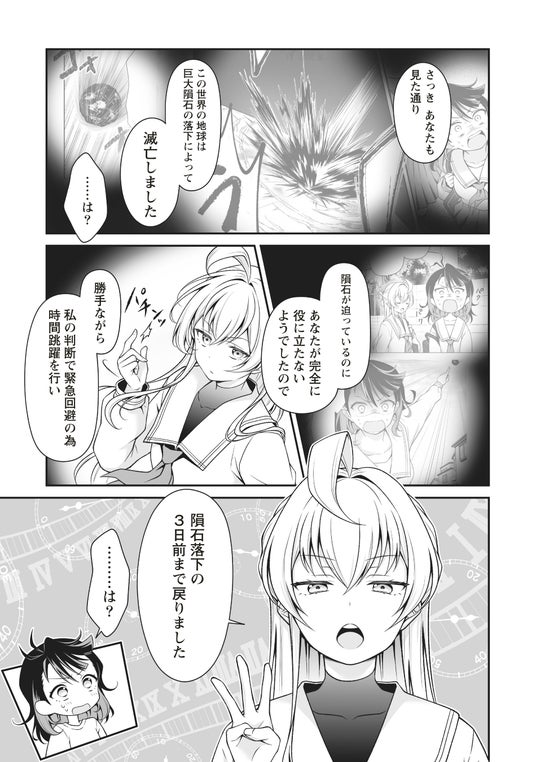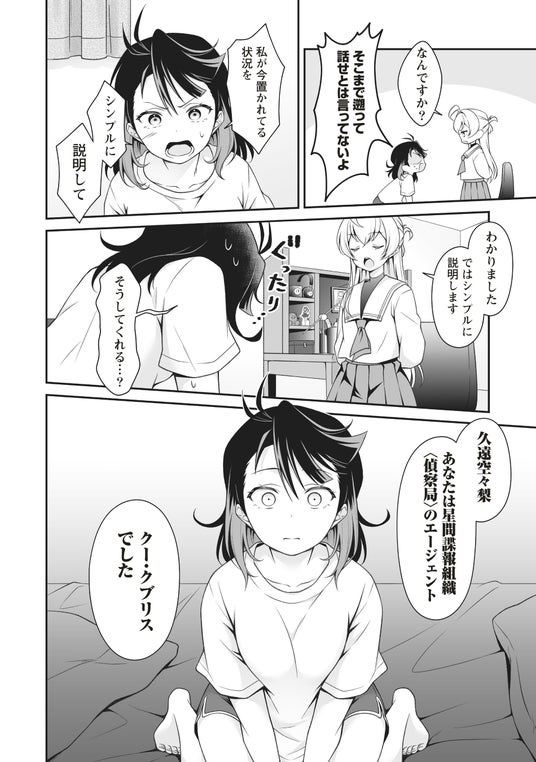 女子高生・久遠空々梨(くどうくくり)は下校中、巨大隕石の落下に遭遇し、 全人類は一瞬にして滅亡してしまう。 ――が、目を覚ますと、そこはなぜか衝突の3日前。 混乱する空々梨に対し、従姉妹の非数値ヌル香(ひすうちぬるか)は 衝撃の事実をつきつける――。 普通の女子高生だった彼女が、実は星間諜報組織のエージェントだった!? 宇宙がヤバイ大活劇、堂々スタート!!