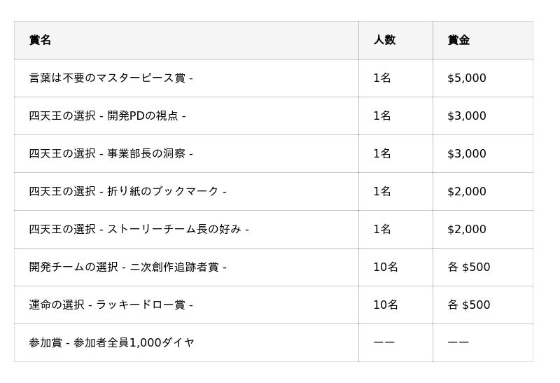 応募いただいた方全員に、1,000ダイヤを差し上げる他、賞金総額が25,000USドルとなります。