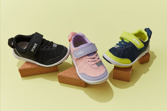 子ども自身での履きやすさに配慮した「アウトサイドストラップ」や、子どもの健やかな足の成長を育むインソール「ウィンドラスソーサー (R)」など IFME のオリジナル機能を搭載しています。IFME公式ウェブサイト: https://ifme.jp/