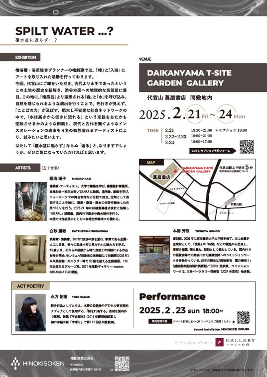 木製浴槽専門メーカーの檜創建は、「檜と入浴」にアートを取り入れたインスタレーション・イベント「SPILT WATER…?」を、アーティストと共に「DAIKANYAMA T-SITE」で開催いたします。