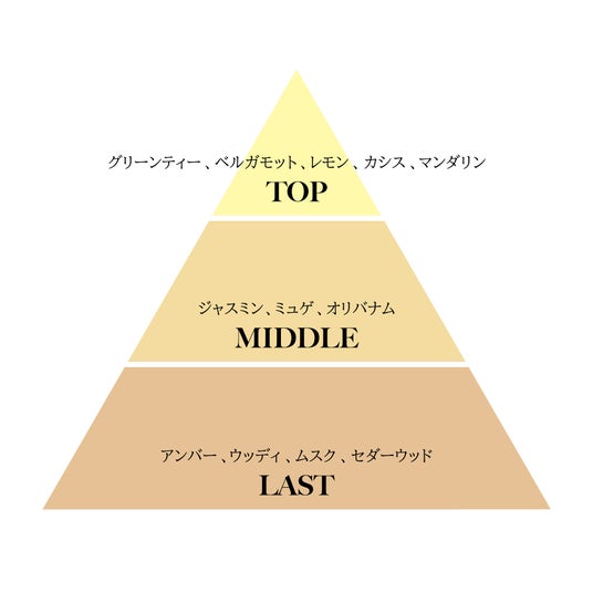 落ち着きのあるウッディ調をベースにレモン果皮や、マンダリンオレンジがトップに抜け調和したリラックス感の高い香りとなっております。