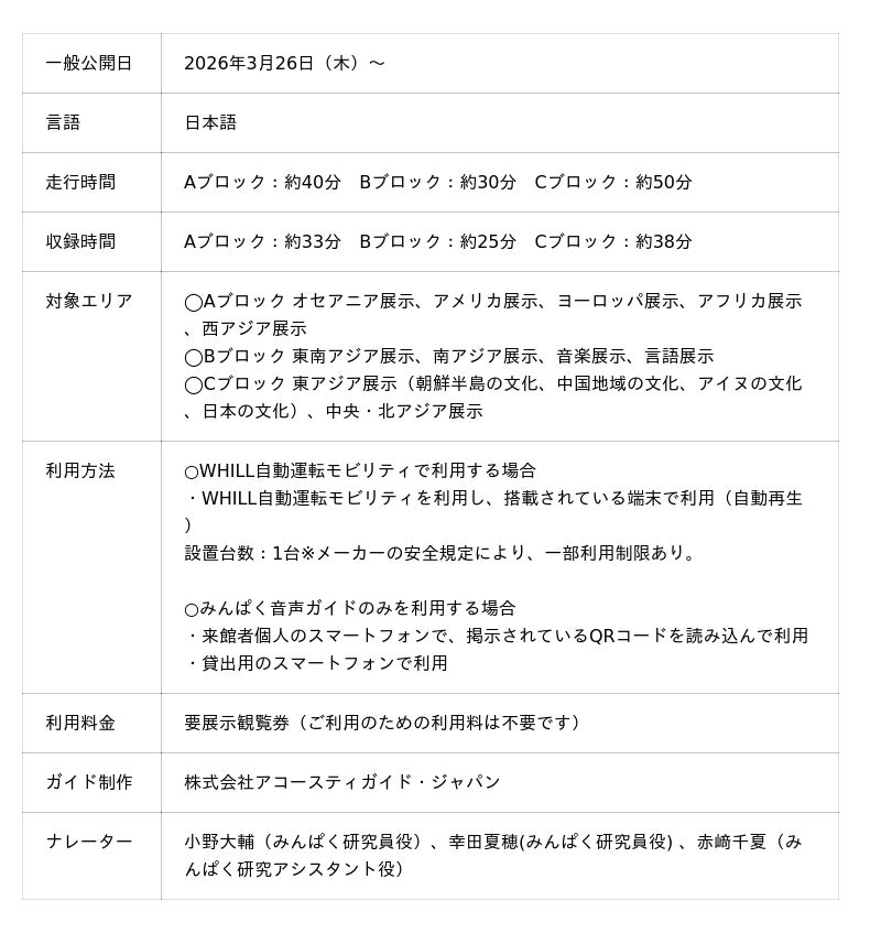 WHILL株式会社(本社:東京都品川区、代表取締役社長 CEO:杉江理、以下「WHILL(ウィル)社」)は、国立民族学博物館(以下「民族学博物館」)において採用されているWHILL自動運転モビリティと、WHILL自動運転モビリティと連動した音声案内システム「みんぱく音声ガイド」の対象エリアが拡張し、2026年3月26日(木)より全展示場(A・B・Cブロック)での運用が開始することを発表いたします。本取り組みにより、来館者は全展示場を自動走行するモビリティに乗車しながら、声優による掛け合い形式の音声ガイドとともに巡る、新たな展示体験を楽しむことが可能となります。