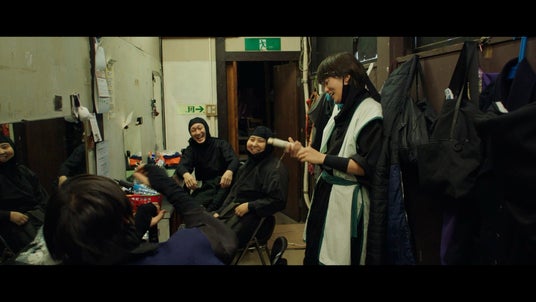 楽屋にて、忍者ショーを終えた忍者たちの談話の様子
