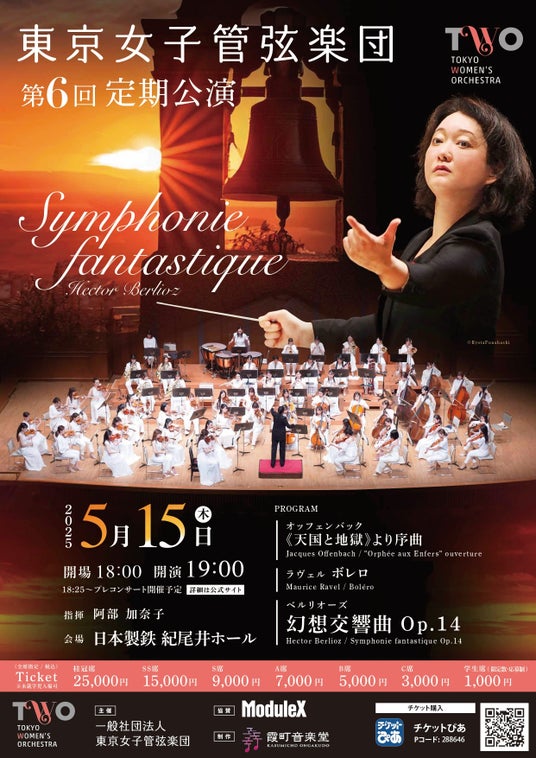 2025年5月15日、日本製鉄 紀尾井ホールにて、東京女子管弦楽団の第6回定期公演を開催いたします。本公演のメインプログラムとなるベルリオーズの幻想交響曲では、ストーリーを象徴する重要な「鐘」の音に注目です。そのほか、フランス作曲家にフォーカスしたバラエティに富んだ楽曲をご用意しております。また今回初タッグとなる、「阿部加奈子氏×東京女子管弦楽団」の音色もぜひお楽しみください。