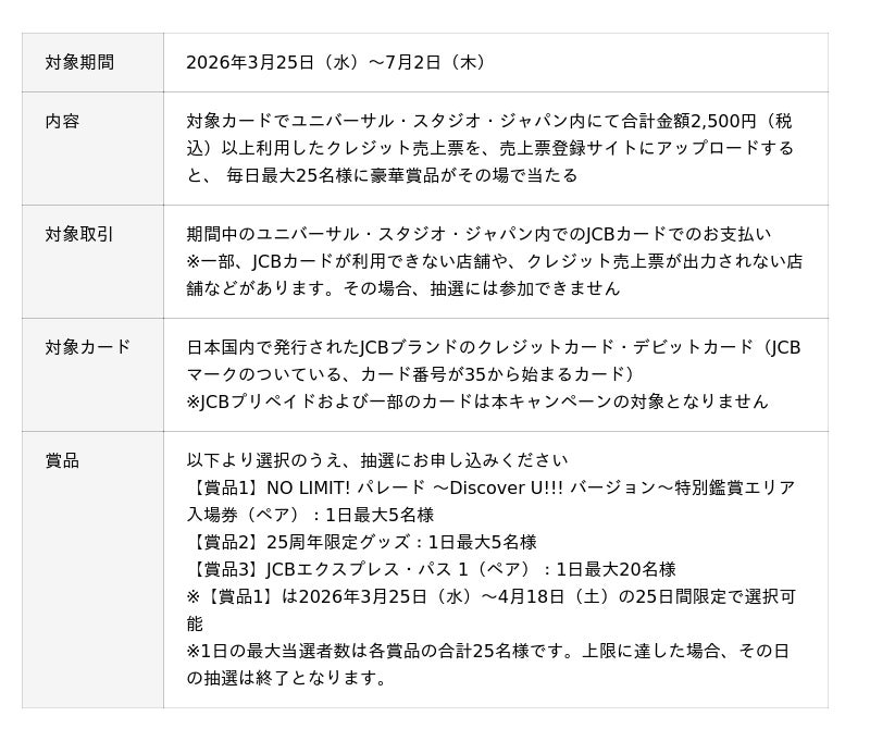 ユニバーサル・スタジオ・ジャパン開業25周年の節目の年に、JCB会員様向けのおすすめ情報やキャンペーン情報を集約した特設ページ「ユニバーサル・スタジオ・ジャパン インフォメーション」を新設しました。今後のキャンペーン情報やJCB会員様限定のサービスなど、25周年を楽しみ尽くすためのコンテンツを順次拡充していきます。◆主な掲載内容