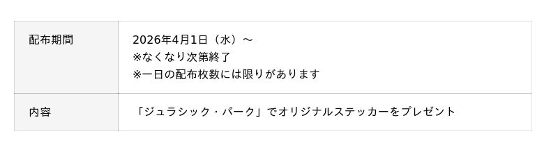ユニバーサル・スタジオ・ジャパンの25周年に加え、JCBが協賛する人気アトラクション「ザ・フライング・ダイナソー」も10周年を迎えます。この“ダブルアニバーサリー”を記念し、この期間しか手に入らないオリジナルステッカーをパーク内で配布します。ぜひパークに来場して、手に入れてください。
