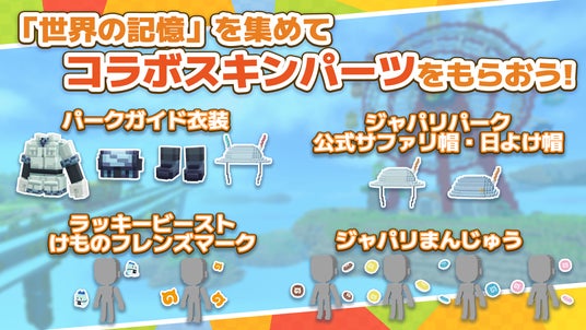 コラボワールド「フレンズと浮島の記憶」では、「パークガイド衣装」や「ジャパリパーク公式サファリ帽」などの限定のスキンパーツが入手できます。