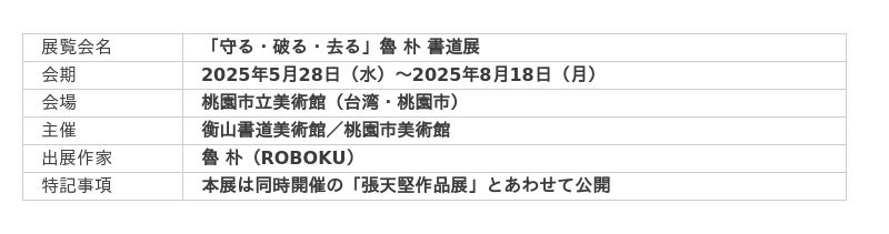 台湾・桃園市美術館が主催する「2025 横山書法藝術館(書道専門美術館)」において、日本文化継承プロジェクト「狼煙」公式クリエイターである魯 朴(ROBOKU)氏による個展が開催されています。展覧会は2025年5月28日から8月18日まで、横山書法藝術館(書道専門美術館)を舞台に開催され、書道表現の可能性を広げる2つの注目展示が同時公開中です。
