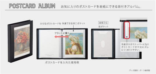 お気に入りのポストカードを表紙にできる窓付きアルバムです。美術館や博物館などの展覧会、映画館、アーティストのグッズとしてポストカードは多く販売されており、購入してコレクションしている方も多いジャンルです。しかし、市場にあるハガキ収納製品は年賀状を入れるような事務品感が強いものが多いため、今回コレクター向けにシンプルなデザインで商品化いたしました。お気に入りのポストカードを表紙にすることでお好みの表紙にして楽しむことができます。