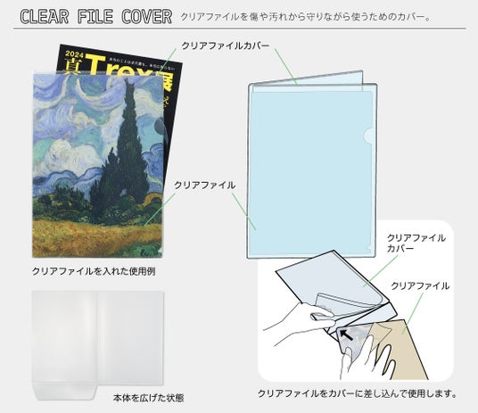 美術館や、博物館(映画館)など商業施設や、イベント会場で購入した“お気に入り”のクリアファイルを保護しながら使用するためのカバーです。
