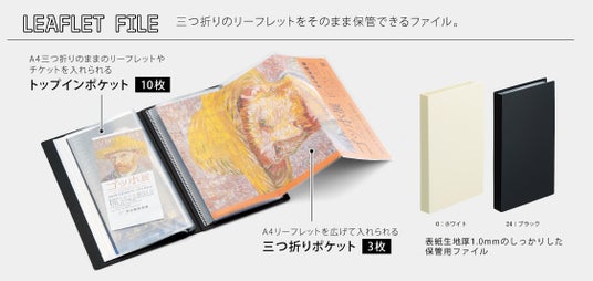 美術鑑賞を趣味とする方に聞き取りを行ったところ、美術館や観劇、映画鑑賞後に残るチラシや入場券の半券などを、思い出として取ってはいるものの、その後の扱いに困っている人が多いことが分かりました。そこで、A4サイズとA5サイズのポケットが合体した専用ポケットを作り、美術鑑賞などの思い出を簡単にまとめられるクリヤーブックを商品化いたします。