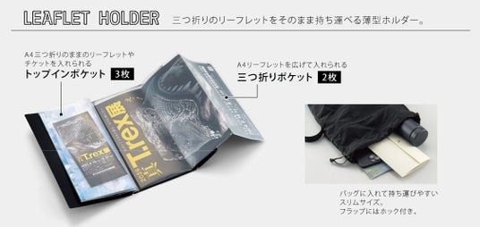 博物館や観光地などで配布されているA4三つ折りサイズのリーフレットや、チケットを持ち運べる薄型ホルダーです。A4サイズのパンフレットを三つ折りにしてコンパクトに持ち歩くことができるポケット2枚付いた仕様です。フラップにはホック付きでバッグに入れて持ち運びしやすいスリムサイズの商品です。