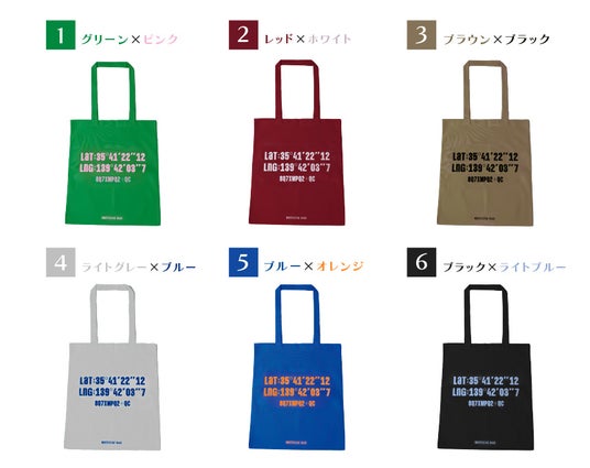 「ルミネ新宿2店」のGPS座標をのせたデザインのトートバッグを全6色ご用意しました。