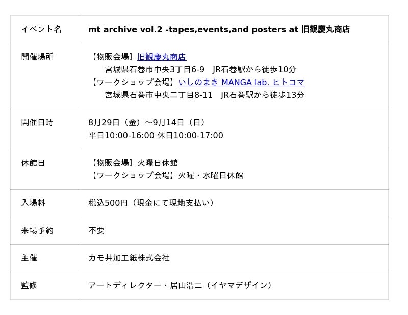 文具・雑貨向けマスキングテープ”mt masking tape”を製造するカモ井加工紙株式会社(本社:岡山県倉敷市)は、「mt archive vol.2 -tapes,events,and posters at 旧観慶丸商店」を8/29~9/14の期間、宮城県石巻市にて開催します。