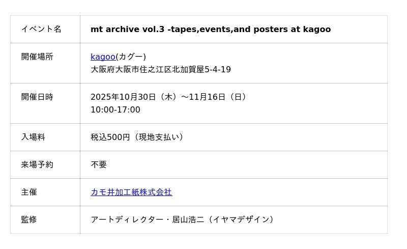 文具・雑貨向けマスキングテープ”mt masking tape”を製造するカモ井加工紙株式会社(本社:岡山県倉敷市)は、「mt archive vol.3 -tapes,events,and posters at kagoo」を10/30~11/16の期間、大阪市住之江区にて開催します。