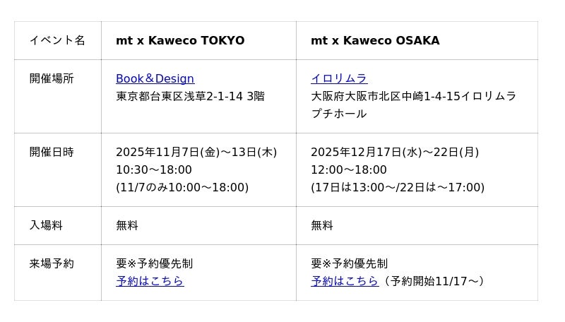 文具・雑貨向けマスキングテープ”mt masking tape”を製造するカモ井加工紙株式会社(本社:岡山県倉敷市)は、「mt × Kaweco」を東京都・大阪府の2会場で開催いたします。