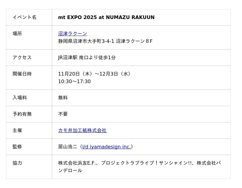 文具・雑貨向けマスキングテープ”mt masking tape”を製造するカモ井加工紙株式会社(本社:岡山県倉敷市)は、静岡県沼津市にて、mtの博覧会「mt EXPO」を開催いたします。