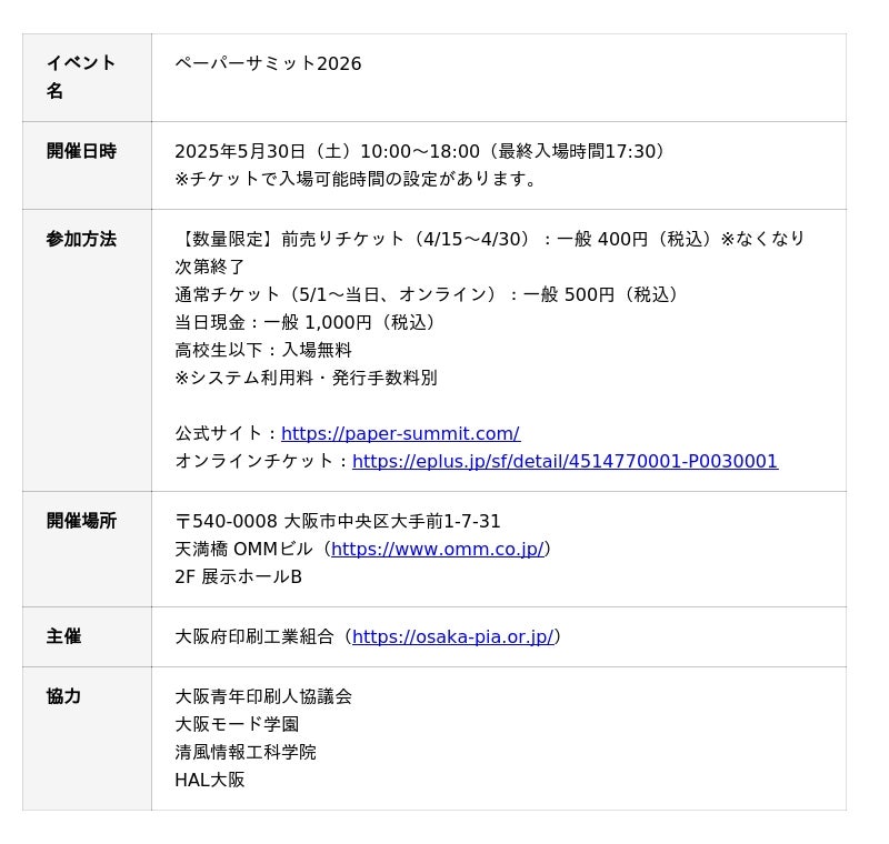 大阪府印刷工業組合(大阪市都島区 理事長:高本 隆彦)」は2026年5月30日(土)10:00~18:00、天満橋OMMビルの2F 展示ホールBにて、紙と印刷の祭典「ペーパーサミット2026」を開催いたします。