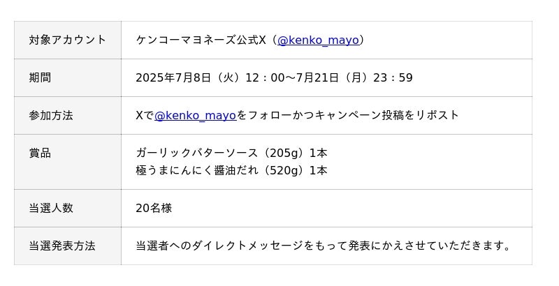 ケンコーマヨネーズ株式会社(東京本社:東京都杉並区、代表取締役社長:島本 国一、以下「当社」)は、日頃のご愛顧に感謝し、当社公式Xをフォロー&リポストすると、当社人気の2商品がセットで当たるキャンペーンを本日7月8日(火)から7月21日(月)まで実施します。