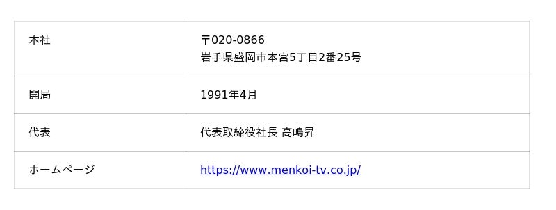 株式会社岩手めんこいテレビ(mit)は、岩手県を放送エリアとするテレビ放送局です。岩手県内のニュースを伝える「mit Live News」や来年で放送30年となる人気番組「山・海・漬」や、タレントの河合郁人さんがMCを務める生放送番組「サタデーファンキーズ」などを制作放送しています。