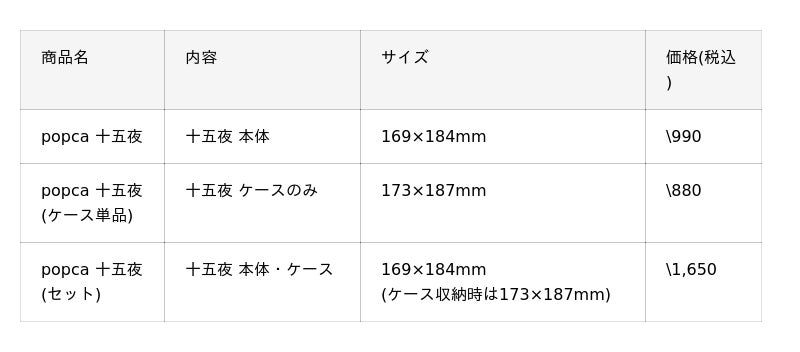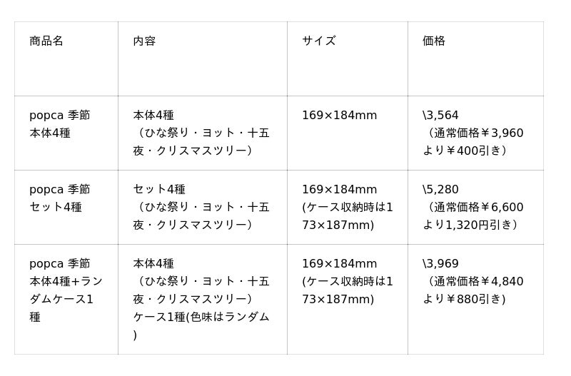 今回は新作『popca 十五夜』の発売と同時に、春・夏・秋・冬の全4デザインをまとめて楽しめる「四季セット」の販売も開始します。それぞれ単品でもご購入いただけますが、セットなら一年を通して季節の彩りをお得にお楽しみいただけます。ご家族やご友人への、カジュアルギフトにもおすすめです。