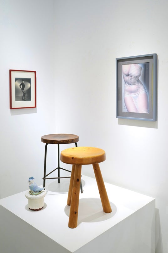 ギャラリストでありアートピースのコレクターでもあるティエリー氏がセレクトした、ミッドセンチュリーの巨匠たちによるスツールや椅子、テーブルといったヴィンテージ家具に対し、小宮山書店で取り扱う同年代のヴィンテージポスターや、エアブラシによるフェティッシュな作品、柳宗悦が創刊し芹沢銈介等が装幀を手掛けた雑誌『工藝』(1931-1951)、現代のセラミック作品などをあわせることで、それぞれの美しさが呼応し、新たな魅力を放ちます。