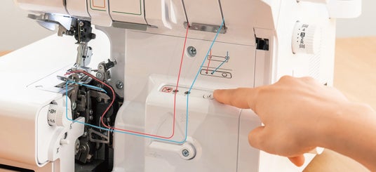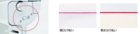 ステッチ切替レバーを手前に引くだけで、細ロックぬい・巻きロックぬいを簡単に切り替えられる。