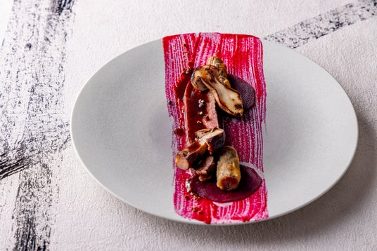 フランクステーキ ビーツと牛蒡(ごぼう)ワインソースを添えて