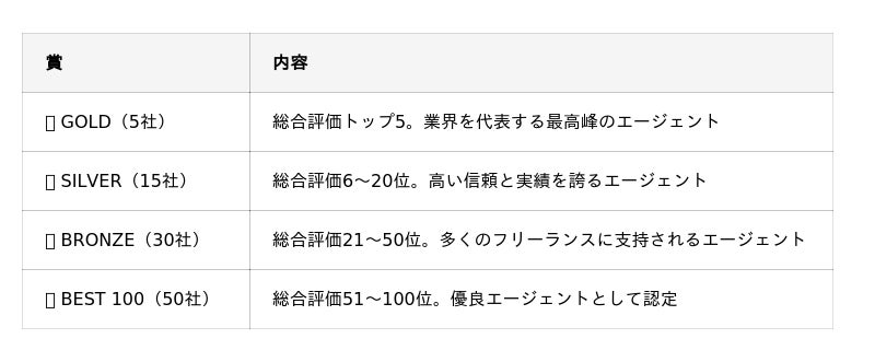 BRONZE 受賞企業(30社)およびBEST 100(50社)を含む全受賞企業一覧は、発表サイト(https://freelance-board.com/agents/award-2026)にてご確認いただけます。
