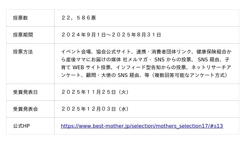子育て期のご両親に「実際に使用してよかった・おすすめしたい商品」を選んでいただき、公募にて投票され、選出されるアワードです。 売上 No.1 ではなく、ママたちの信頼や共感・好感の 1 位を表彰した賞です。