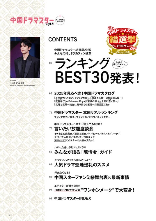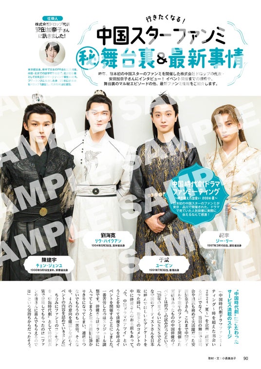 さらに、中国本土の各種リアルランキングや推しの魅力を語り明かす座談会企画、大ヒットドラマの聖地巡礼ガイドや中国スターのファンミーティング(秘)舞台裏&最新事情など、推し活にお役立ちの企画が盛りだくさんだ。