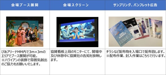 当日の公演におけるMCによる紹介や、事前に媒体(チラシ、HP、SNSなど)への貴社名の掲載も可能です。会場であるぴあアリーナMMでのブース展開はもちろん、「みなとみらいハワイフェス」での展開もございます。