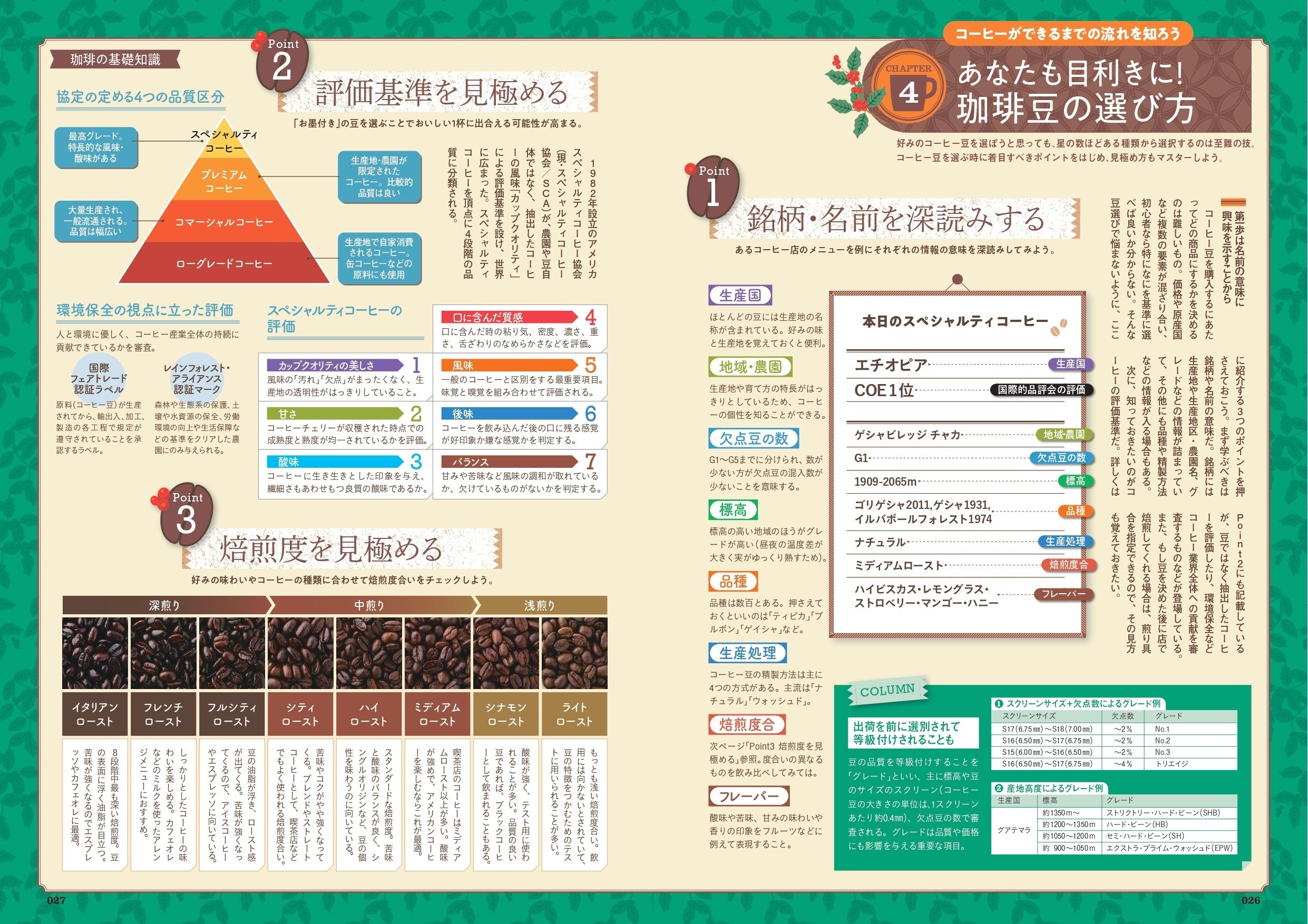 まずは、豆選びの3つのポイントをインプット。中南米やアフリカ、アジアの各国で生産されているコーヒー豆の違いを、豆の種類ごとに解説。スケールもついた、理解しやすいカタログ形式です。