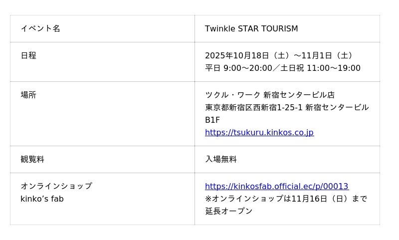 キンコーズ・ジャパン株式会社(本社:東京都港区、代表取締役社長:渡辺 浩基、以下 キンコーズ)は、2025年10月18日(土)より、キンコーズのコワーキングスペース「ツクル・ワーク 新宿センタービル店」(以下、ツクル・ワーク)にて、イラストレーター Aki Ishibashi(アキ イシバシ)とのコラボレーション展示「Twinkle STAR TOURISM(トゥインクル・スター・ツーリズム)」を開催します。本展示は、架空の観光会社をモチーフに、惑星や不思議な生き物が描かれたアート作品を通じて、誰もが宇宙旅行気分を楽しめる体験型アートイベントです。