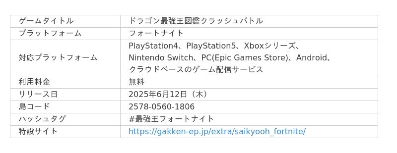 株式会社Trippy(本社:東京都新宿区、代表取締役社長:漆原陸、以下Trippy)は、株式会社Gakken(東京・品川/代表取締役社長:南條達也、以下Gakken)、Alche株式会社(本社:東京都渋谷区、代表取締役:川 大揮、以下Alche)と共同で、6億人以上が遊ぶオンラインゲーム「フォートナイト(Fortnite)」において、超人気書籍『ドラゴン最強王図鑑』をテーマにしたオリジナルゲーム『ドラゴン最強王図鑑クラッシュバトル』を公開します。