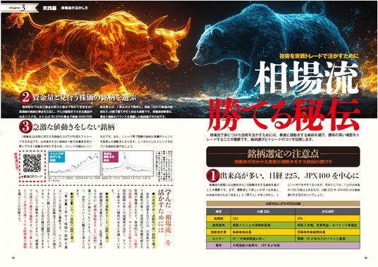特別企画の2として、世界のトレーダーのスタンダードである「TradingView」の使い方を解説。また、信用取引でも普通の投資法でも活用できる相場氏チョイスの銘柄を100本用意しました。「TradingView」ではペーパートレード(実地の投資ではない仮想トレード)ができますので、これでまずは練習して、実践に向かいましょう。