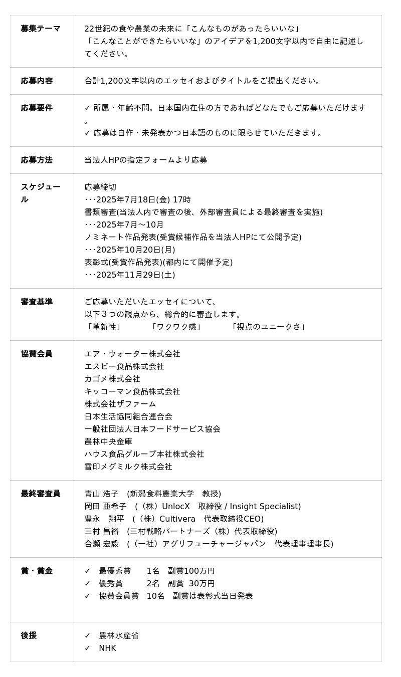 本コンテストを通じて、皆様が思い描く未来を実現するための様々なアイデアやイノベーションの種をビジネス化できる人材を育てることこそが、当法人の責務であると改めて気づかされました。また、皆様からお寄せいただいた多数のご応募に心から感謝するとともに、これからも人材育成を通じて、食や農業の未来に貢献すべく、尽力してまいります。