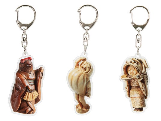 根付とは、印籠や袋物などを腰から提げて携行する際に、腰帯に引っ掛けて用いた留め具(ストッパー)のこと。提げたものが落下するのを防ぐ役割を果たす道具でしたが、時代や所用者の好みを反映して、その姿かたちは千差万別。普段の装いのなかにさりげなく技を凝らした装身具を取り入れることこそ、江戸時代の人は「粋」と考えていました。そんな「掌中の芸術」とも言われる美術館所蔵の根付を、アクリルキーホルダーにしました。カバンやポーチにつけて、江戸時代気分を味わってみませんか。