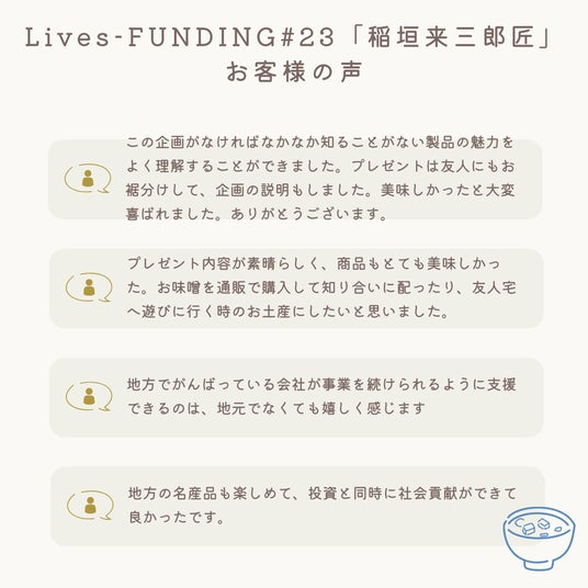 Lives-FUNDING#23『稲垣来三郎匠』お客様の声