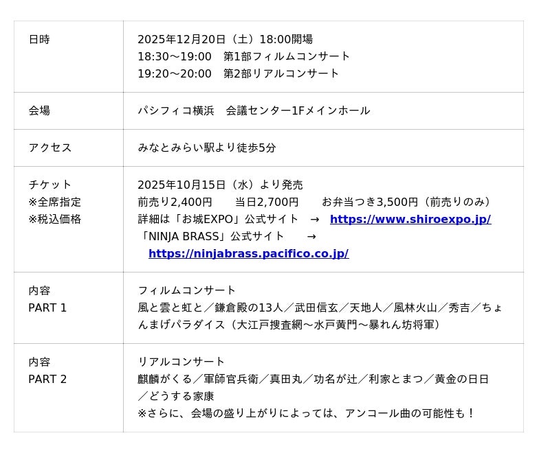 これに合わせて「NINJA BRASSとお忍びの姫君」によるコンサートが、12月12日(金)に国立京都国際会館、12月20日(土)にパシフィコ横浜・会議センター メインホールで開催されます。