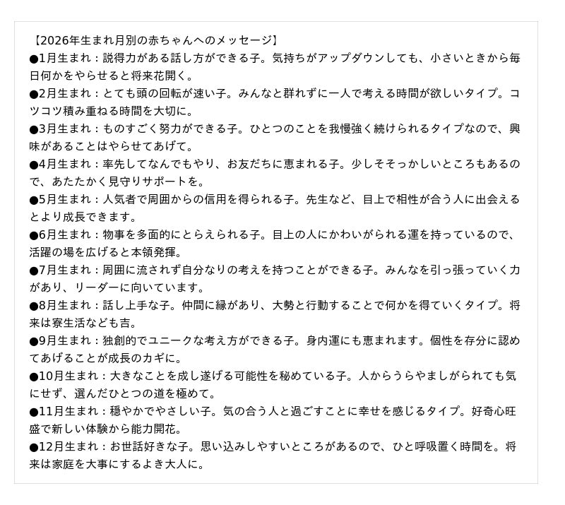 ●「たまひよ」名づけ関連商品・サービス監修より、2026年の生まれ月別の開運メッセージ公開中!