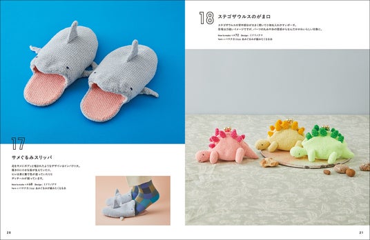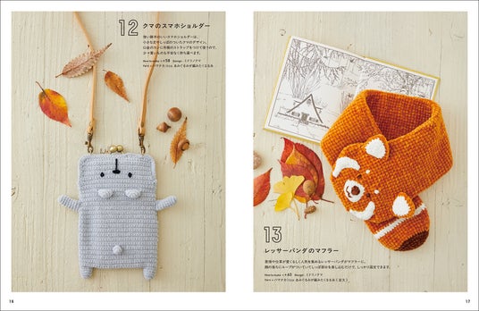 この本では、ポーチ、スリッパ、マフラーなどに動物のあみぐるみがくっついた、普段使いできる雑貨を集めました。