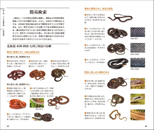 野外観察に必携! 日本のヘビ43種+4亜種を網羅し、色彩・地域変異も多数収録。充実した検索表付きのハンディ版ヘビ図鑑が登場!