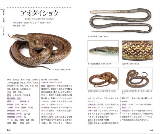 第2章では、43種+4亜種のヘビそれぞれについて、白背景の写真に加え、模式産地、分布、全長などの各種データ、特徴や見分け方、生息環境、見つかる場所、活動時間、行動、食性、採餌、繁殖、毒性、保全状況を解説。