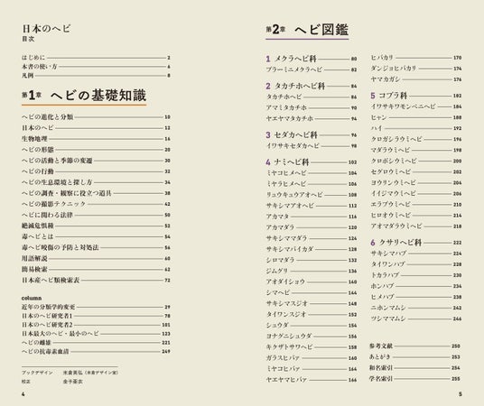 第1章では、ヘビの生物学・形態学的特徴をはじめ、ヘビの活動と季節の変遷、生息環境と探し方、調査や観察に役立つ道具、写真撮影テクニック、ヘビに関わる法律、絶滅危惧種、毒ヘビとその対処法、用語解説と、ヘビに関する基礎知識をていねいに解説。